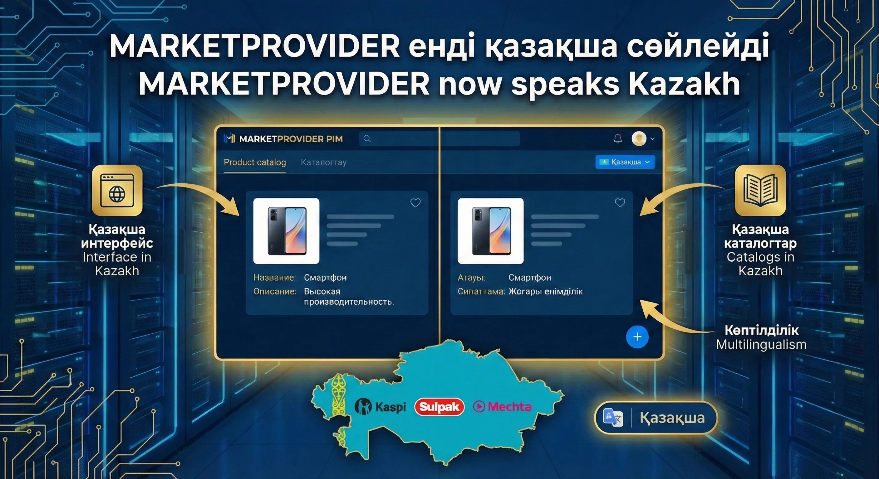 We've added Kazakh language support to the MARKETPROVIDER PIM system — now you can work with both the interface and catalogs in Kazakh.